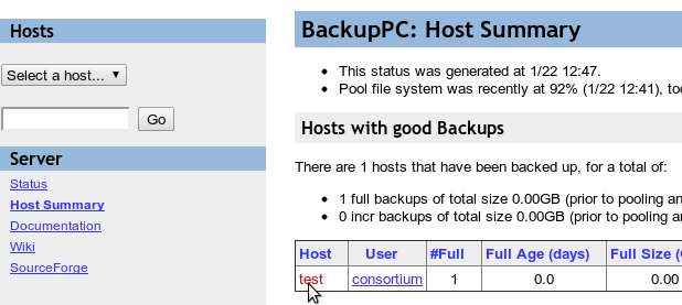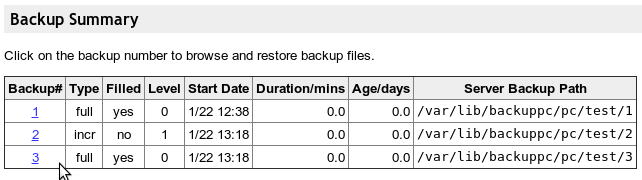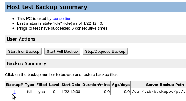 The “Backup Summary” table shows the history of backups that have been performed from this host. Files can be reverted to a previous version by restoring them from a backup performed at previous date or time.