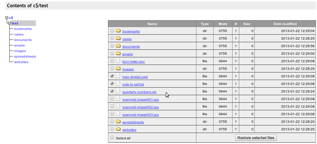 4. Alternatively, to restore a group of files or folders place a check mark in the boxes next to their names and click the Restore selected files button at the bottom of the table. This will present you with 3 options: